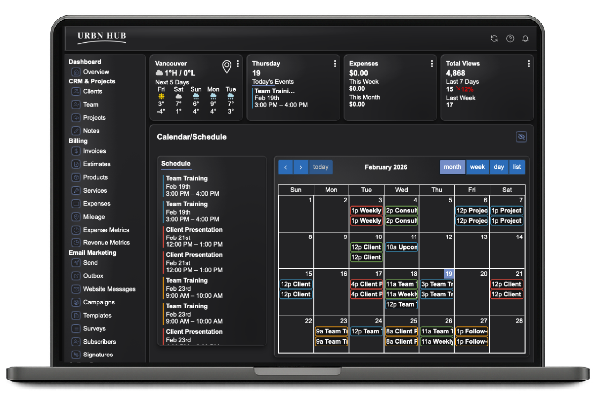 URBN Hub brings every part of your business into one place. Stay organized, automate admin, and manage clients, schedules, billing, projects, and marketing - all from a simple, intuitive workspace.