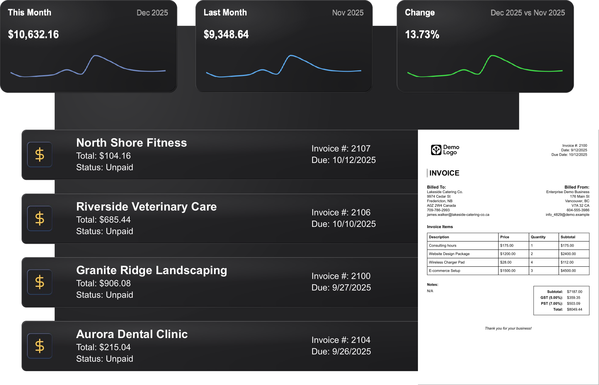 - ✓ Fast branded invoices with auto tax, line items, and Mark as Paid
