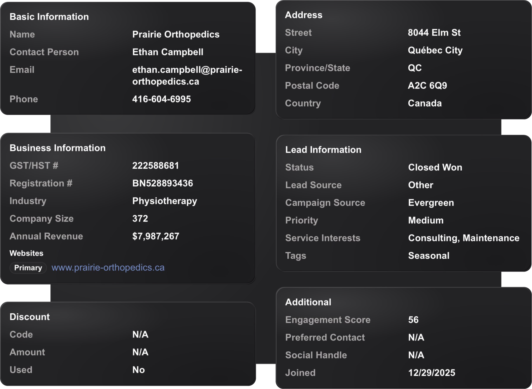 URBN Hub Core stores more than basic contact info. Keep business details, lead status, address information, notes, websites, tags, service interests, and other account data in one structured profile that is easy to review at a glance.