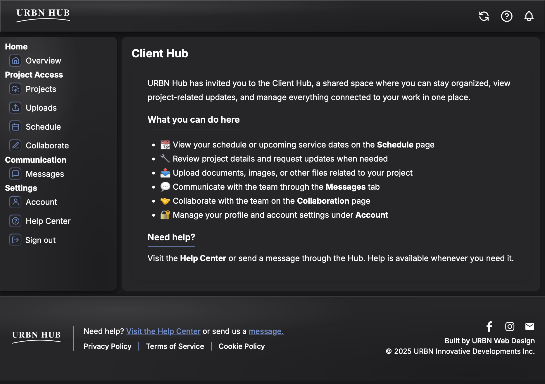 Keep client details, project activity, uploads, notes, invites, and messages connected in one organized system. URBN Hub Core gives you a clean foundation for managing client relationships and the work tied to them.