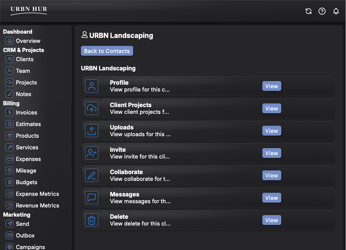 URBN Hub Core gives you a single place to manage clients, leads, project history, files, contact details, and activity. Instead of bouncing between spreadsheets, inboxes, and folders, you get one organized view of the relationship and the work.